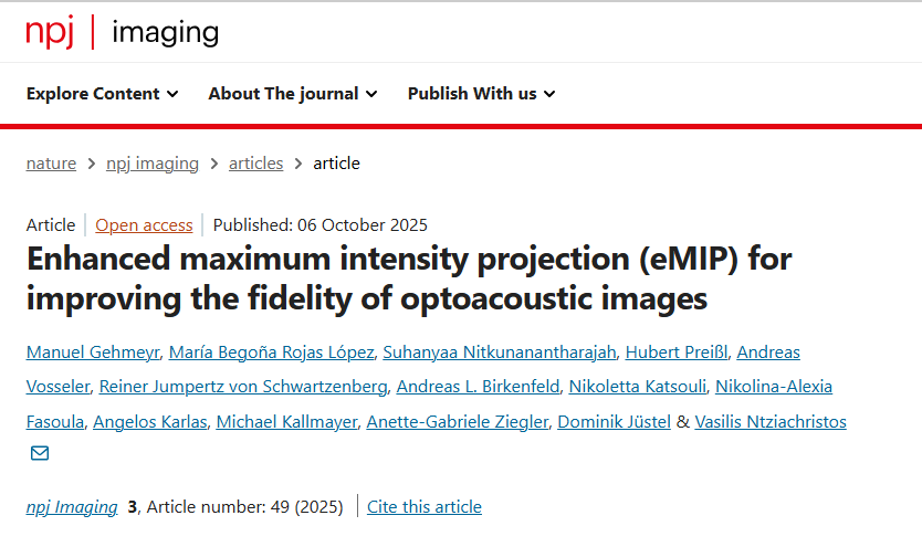 Our newes paper is published in the journal npj Imaging, titled “Enhanced maximum intensity projection (eMIP) for improving the fidelity of optoacoustic images.” In it, we introduce enhanced maximum intensity projection (eMIP), a novel visualization method for improving the fidelity of 2D images derived from 3D optoacoustic scans. eMIP corrects for misalignments in skin surface geometry and applies dynamic contrast adjustments to better represent anatomical features, particularly the dermal microvasculature. Validated on 1,725 raster-scan optoacoustic mesoscopy (RSOM) scans, eMIP consistently outperformed conventional MIP in perceived image quality, as rated by eight experts. The method is computationally efficient and designed for automated, large-scale clinical use.